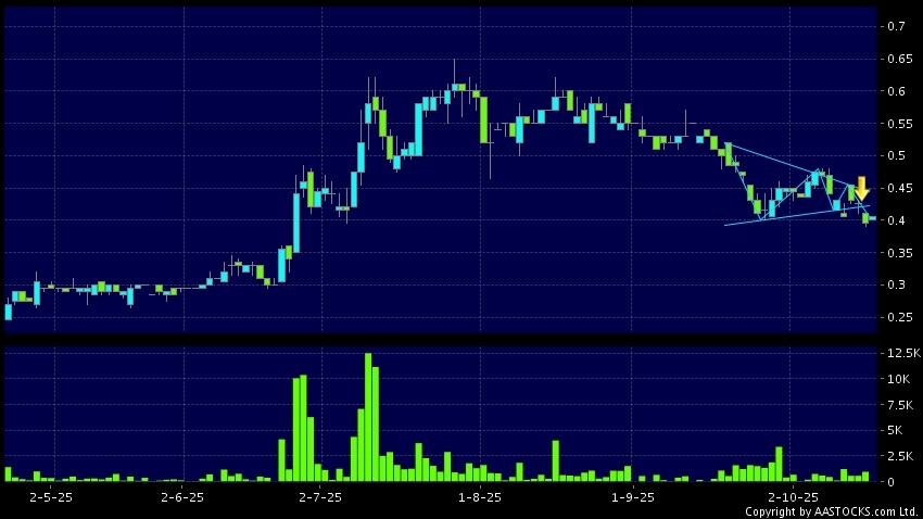 三角形向下突破是指股價的波幅漸漸收窄,在圖表上形成三角形般的狀態。股價在三角形的末端向下突破,下跌趨勢形成,技術走勢偏軟。(港股報價延遲最少十五分鐘。)