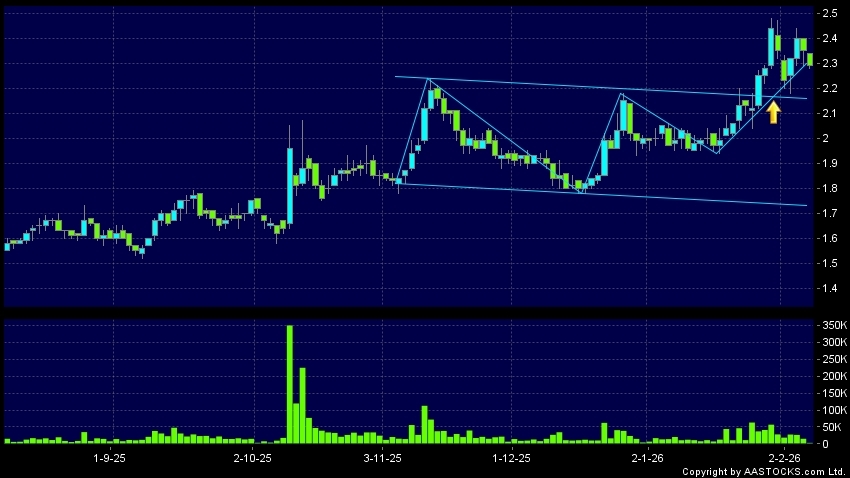 區域突破指股價在過去的一段時間只在一個範圍在內活動,然後股價上升作出突破,升穿區域的頂部,技術走勢向好。(港股報價延遲最少十五分鐘。沽空資料截至 2026-02-06 16:25。)