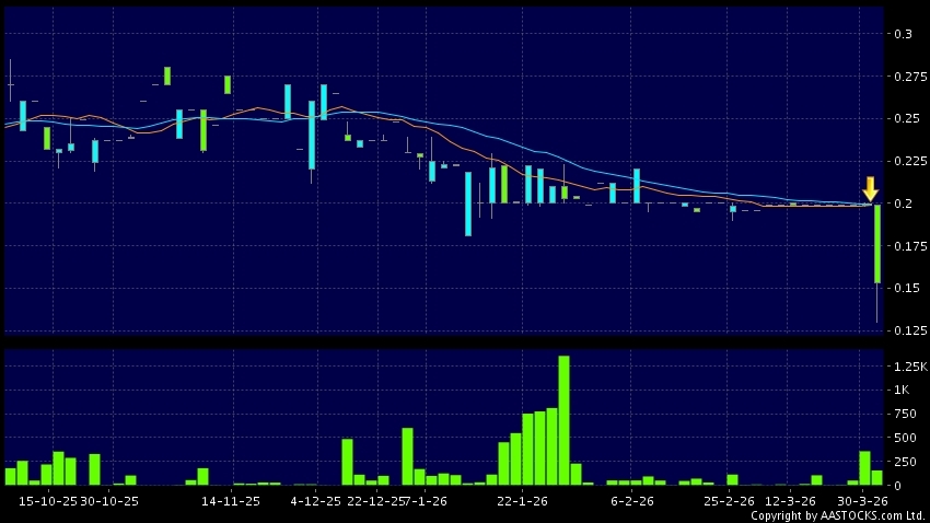 興業控股(00132.HK) +0.001 (+0.503%) 10天移動平均線跌穿20天移動平均線,出現死亡交叉。現價報0.186,下跌6.533%,成交量31.32萬股,成交額5.00萬。