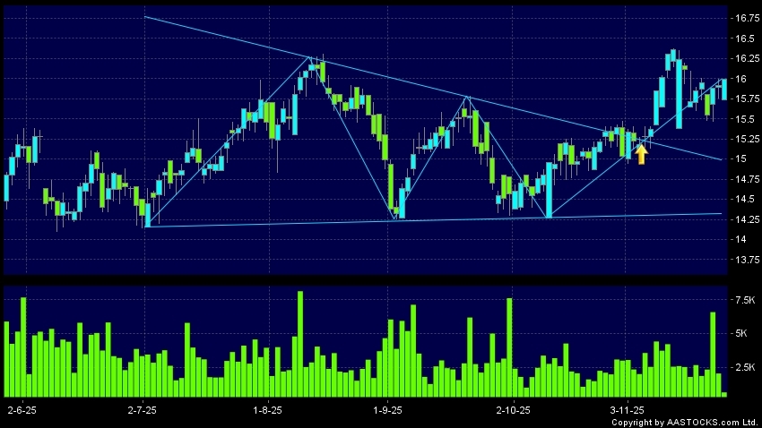 招商局港口(00144.HK) +0.210 (+1.317%) 沽空 $8.53百萬; 比率 16.918% 呈現三角形向上突破。現價報15.980,上升0.377%,成交量68.93萬股,成交額1.10千萬。