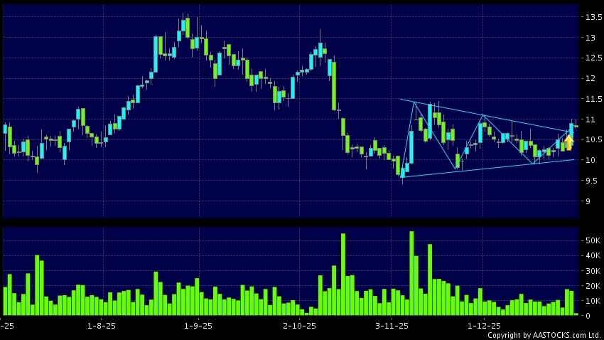 三角形向上突破是指股價的波幅漸漸收窄,在圖表上形成三角形般的狀態。股價在三角形的末端向上突破,形成上升趨勢,技術走勢向好。(港股報價延遲最少十五分鐘。沽空資料截至 2026-01-23 16:25。)