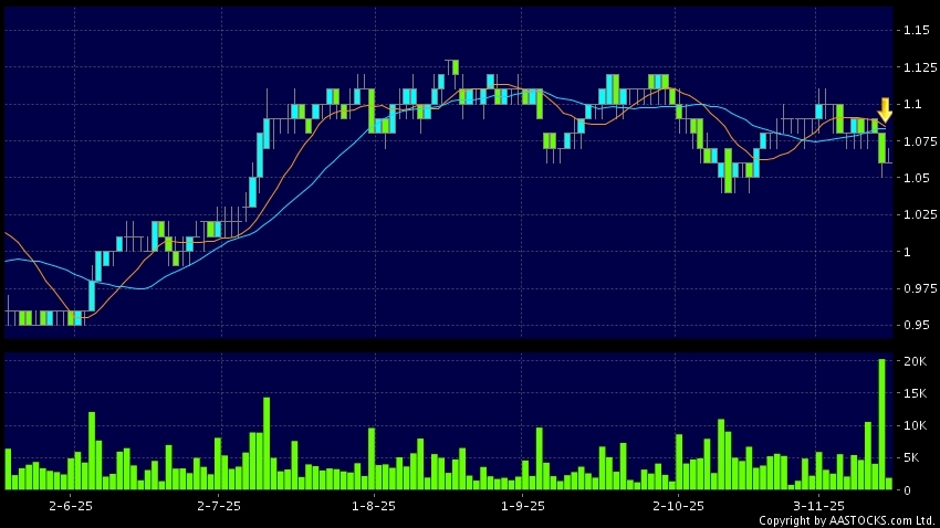 和記電訊香港(00215.HK) +0.020 (+1.653%) 沽空 $86.11萬; 比率 6.412% 10天移動平均線跌穿20天移動平均線,出現死亡交叉。現價報1.060,無升跌,成交量1.94百萬股,成交額2.05百萬。