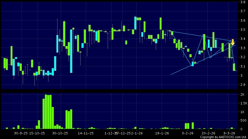 三角形向下突破是指股價的波幅漸漸收窄,在圖表上形成三角形般的狀態。股價在三角形的末端向下突破,下跌趨勢形成,技術走勢偏軟。(港股報價延遲最少十五分鐘。)
