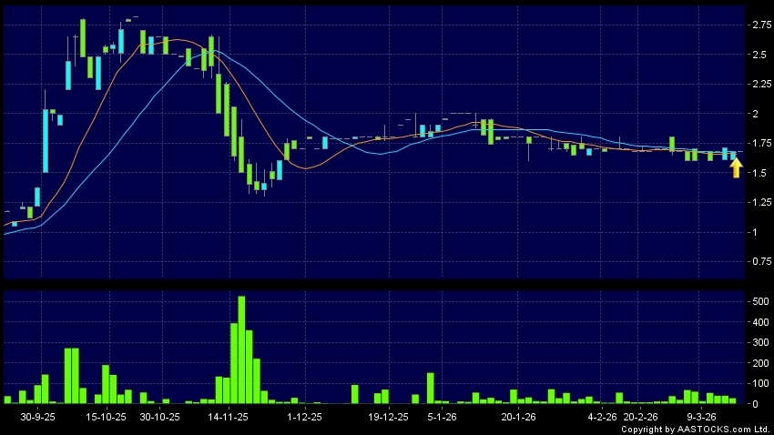 港譽智慧城市服務(00265.HK) +0.020 (+1.266%) 10天移動平均線升穿20天移動平均線,出現黃金交叉。現價報1.680,無升跌,成交量0.00股,成交額0.00。