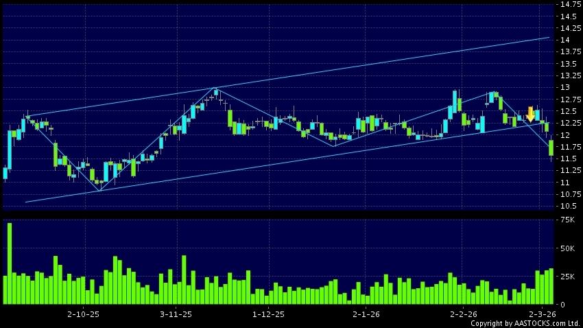 中信股份(00267.HK) +0.030 (+0.266%) 沽空 $6.01千萬; 比率 32.598% 呈現區域下軌突破。現價報11.600,下跌3.894%,成交量3.23千萬股,成交額3.79億。
