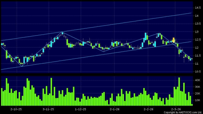 中信股份(00267.HK) +0.070 (+0.612%) 沽空 $4.86千萬; 比率 18.861% 呈現區域下軌突破。現價報11.280,下跌0.353%,成交量4.00百萬股,成交額4.51千萬。