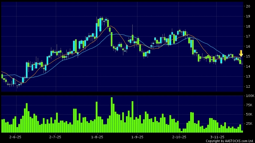 金蝶國際(00268.HK) -0.110 (-0.772%) 沽空 $6.59千萬; 比率 16.808% 10天移動平均線跌穿20天移動平均線,出現死亡交叉。現價報14.180,下跌0.491%,成交量7.26百萬股,成交額1.04億。
