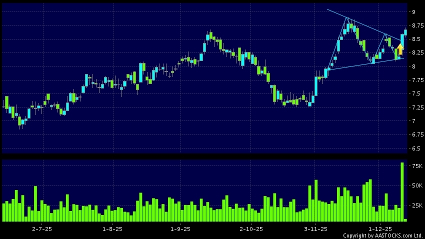 三角形向上突破是指股價的波幅漸漸收窄,在圖表上形成三角形般的狀態。股價在三角形的末端向上突破,形成上升趨勢,技術走勢向好。(港股報價延遲最少十五分鐘。沽空資料截至 2025-12-12 16:25。)