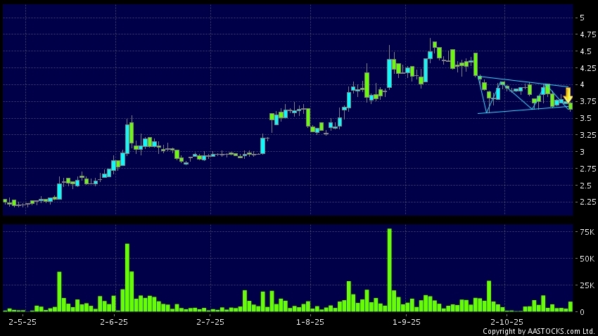 三角形向下突破是指股價的波幅漸漸收窄,在圖表上形成三角形般的狀態。股價在三角形的末端向下突破,下跌趨勢形成,技術走勢偏軟。(港股報價延遲最少十五分鐘。沽空資料截至 2025-10-31 16:25。)