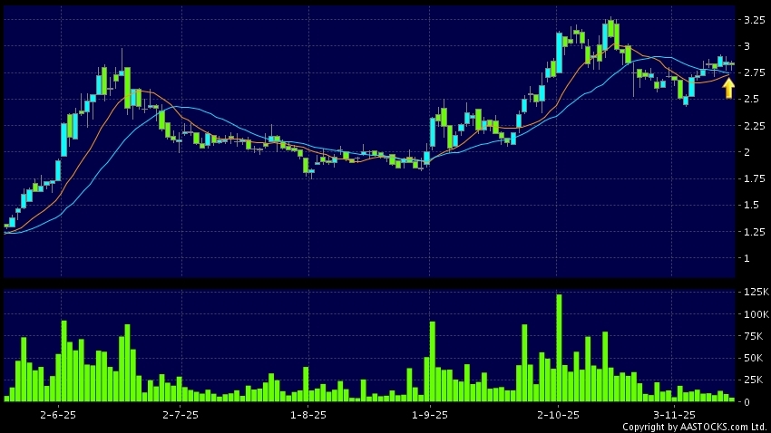 潼關黃金(00340.HK) +0.010 (+0.372%) 沽空 $36.25萬; 比率 3.374% 10天移動平均線升穿20天移動平均線,出現黃金交叉。現價報2.820,下跌1.053%,成交量4.73百萬股,成交額1.33千萬。