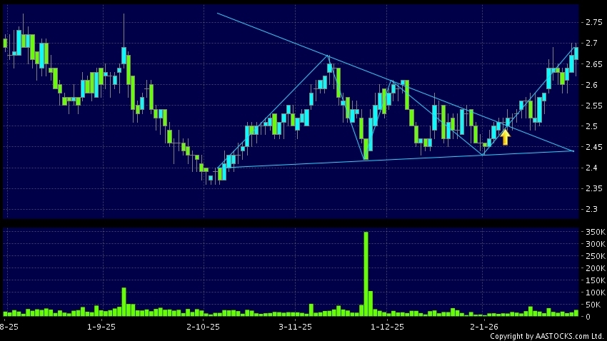 三角形向上突破是指股價的波幅漸漸收窄,在圖表上形成三角形般的狀態。股價在三角形的末端向上突破,形成上升趨勢,技術走勢向好。(港股報價延遲最少十五分鐘。沽空資料截至 2026-02-23 12:25。)