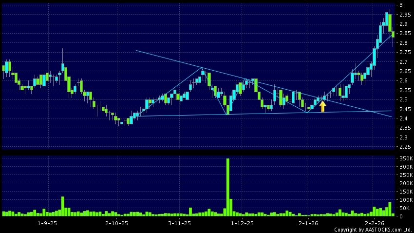 三角形向上突破是指股價的波幅漸漸收窄,在圖表上形成三角形般的狀態。股價在三角形的末端向上突破,形成上升趨勢,技術走勢向好。(港股報價延遲最少十五分鐘。沽空資料截至 2026-02-23 12:25。)