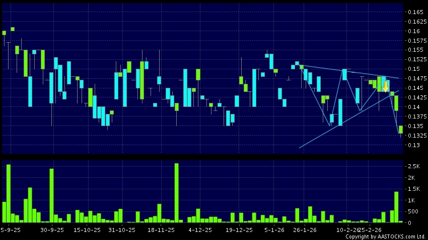 中國管業(00380.HK) +0.007 (+5.691%) 呈現三角形向下突破。現價報0.133,下跌4.317%,成交量7.60萬股,成交額1.02萬。