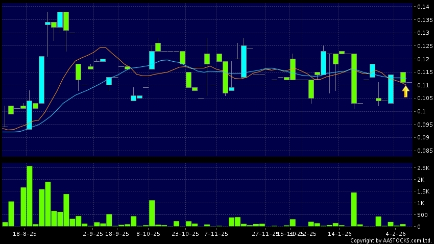 興利(香港)控股(00396.HK) -0.010 (-4.566%) 10天移動平均線升穿20天移動平均線,出現黃金交叉。現價報0.111,無升跌,成交量0.00股,成交額0.00。