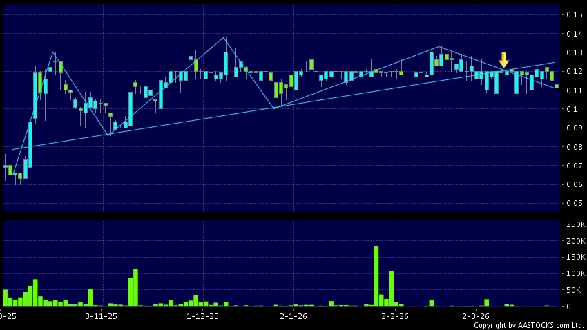 信銘生命科技(00474.HK) -0.002 (-1.695%) 呈現頭肩頂向下突破。現價報0.111,下跌3.478%,成交量6.00萬股,成交額6.78千。
