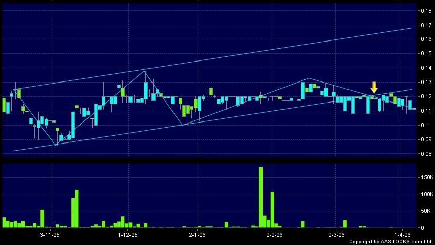信銘生命科技(00474.HK) -0.002 (-1.695%) 呈現區域下軌突破。現價報0.112,下跌4.274%,成交量1.37萬股,成交額1.51千。