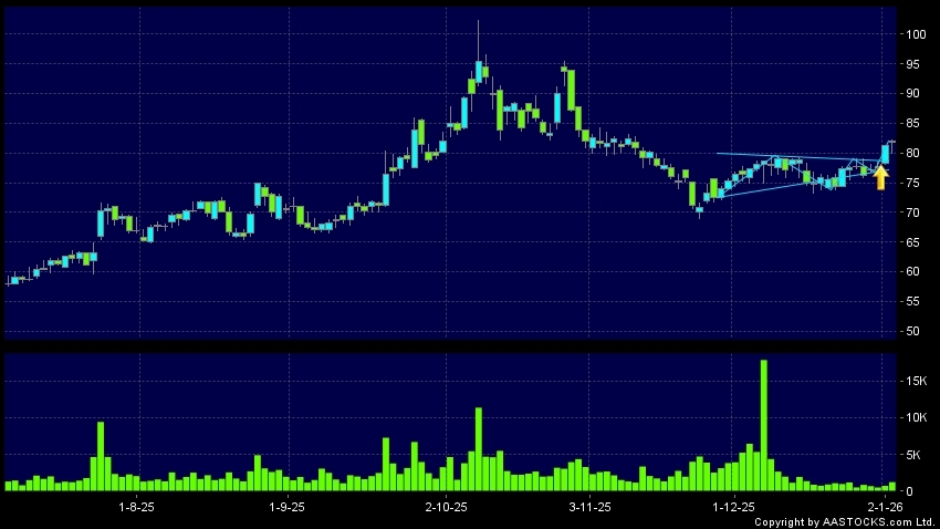 三角形向上突破是指股價的波幅漸漸收窄,在圖表上形成三角形般的狀態。股價在三角形的末端向上突破,形成上升趨勢,技術走勢向好。(港股報價延遲最少十五分鐘。沽空資料截至 2026-01-07 16:25。)