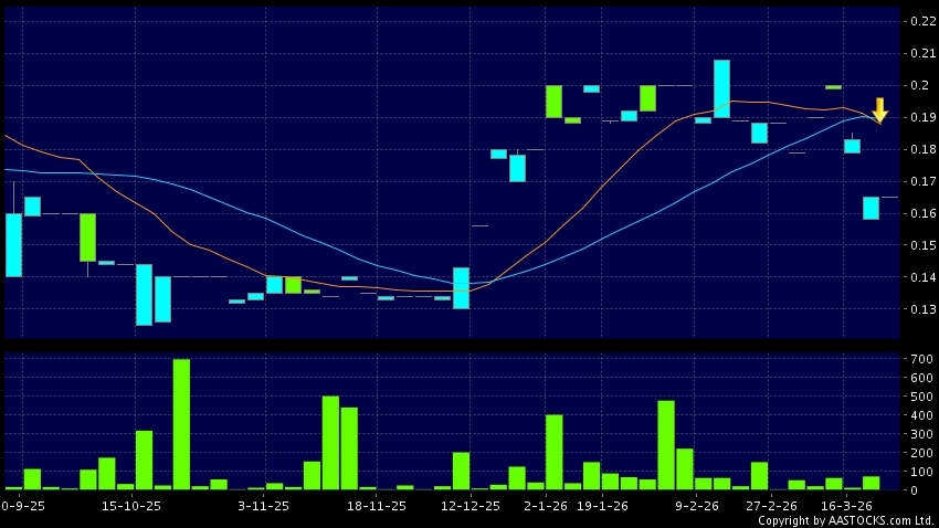迅捷環球控股(00540.HK) -0.008 (-3.846%) 10天移動平均線跌穿20天移動平均線,出現死亡交叉。現價報0.165,無升跌,成交量0.00股,成交額0.00。