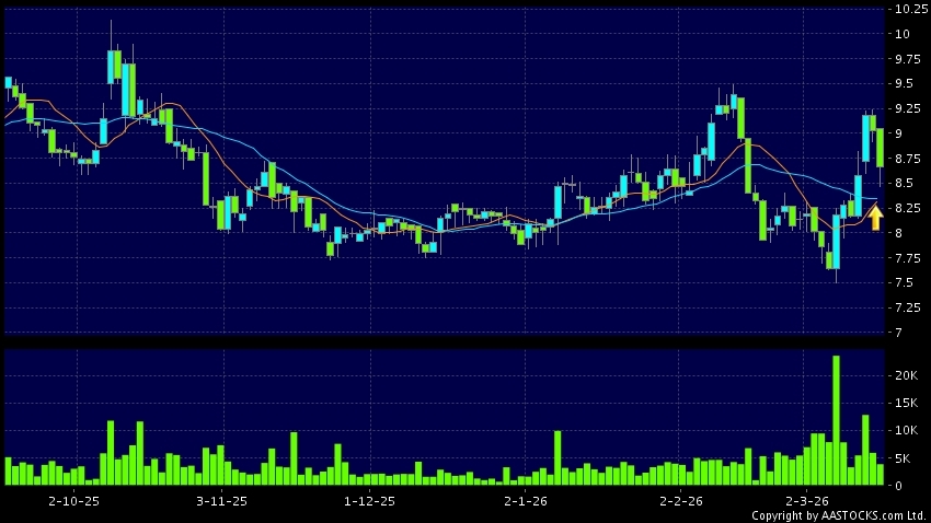 阜豐集團(00546.HK) -0.130 (-1.903%) 沽空 $1.98千萬; 比率 98.568% 10天移動平均線升穿20天移動平均線,出現黃金交叉。現價報8.660,下跌4.097%,成交量3.85百萬股,成交額3.32千萬。