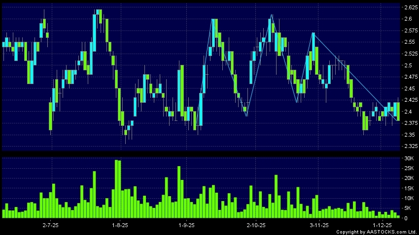 京能清潔能源(00579.HK)呈現三重頂突破向下。現價報2.380,下跌1.653%,成交量1.37百萬股,成交額3.29百萬。最近表現:3日 -1.653%5日 -0.418%10日 +0.847...