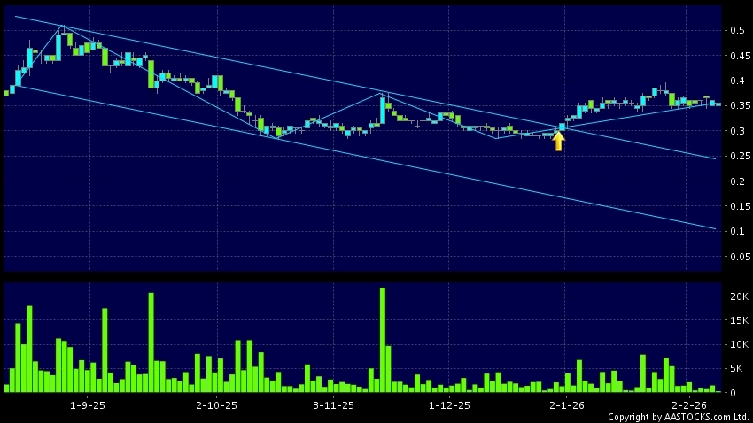 中國高精密(00591.HK) +0.010 (+3.704%) 呈現區域上軌突破。現價報0.355,下跌1.389%,成交量27.50萬股,成交額9.72萬。