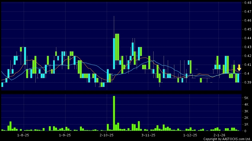 AVCONCEPTHOLD(00595.HK) 0.000 (0.000%) 10天移動平均線跌穿20天移動平均線,出現死亡交叉。現價報0.400,無升跌,成交量0.00股,成交額0.00。