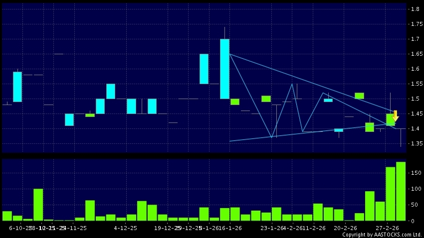 三角形向下突破是指股價的波幅漸漸收窄,在圖表上形成三角形般的狀態。股價在三角形的末端向下突破,下跌趨勢形成,技術走勢偏軟。(港股報價延遲最少十五分鐘。)