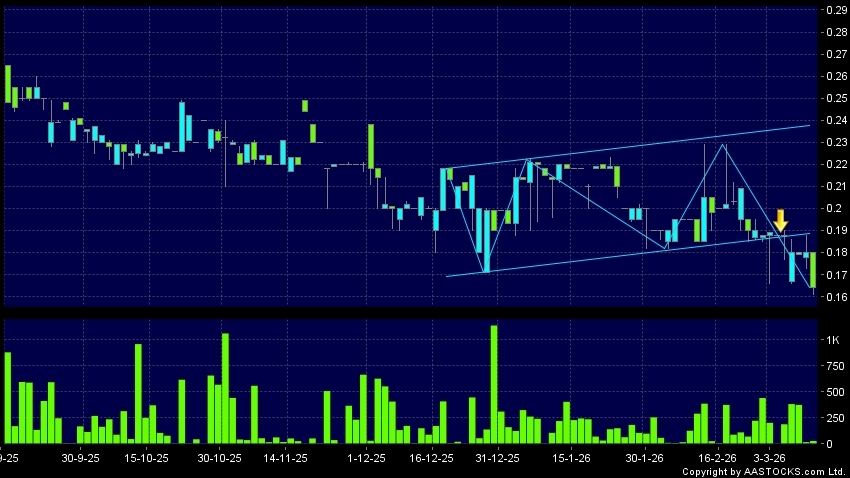 通通AI社交(00628.HK) +0.026 (+11.111%) 呈現區域下軌突破。現價報0.164,下跌8.889%,成交量2.80萬股,成交額4.58千。
