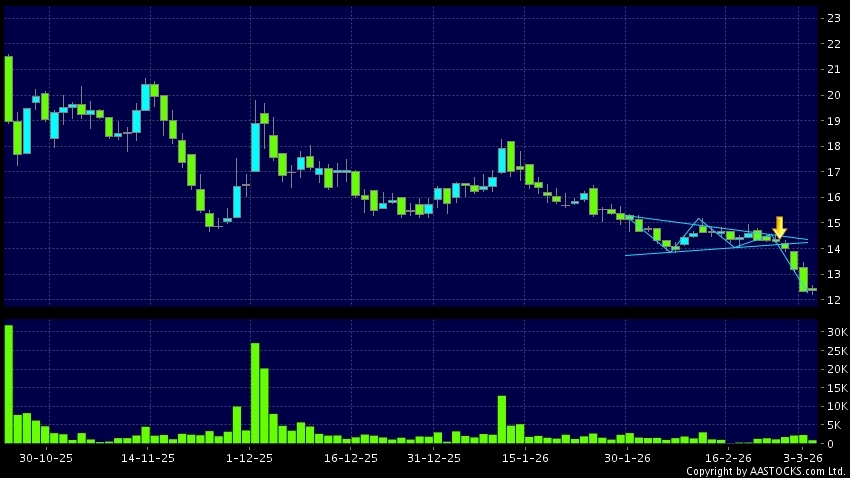 三角形向下突破是指股價的波幅漸漸收窄,在圖表上形成三角形般的狀態。股價在三角形的末端向下突破,下跌趨勢形成,技術走勢偏軟。(港股報價延遲最少十五分鐘。)