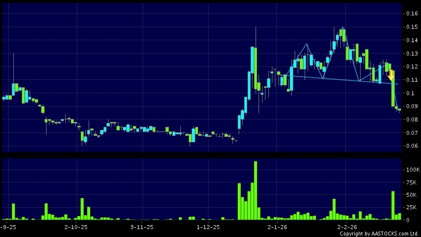 卓悅控股(00653.HK) -0.011 (-12.941%) 呈現頭肩頂向下突破。現價報0.087,下跌1.136%,成交量1.34千萬股,成交額1.16百萬。