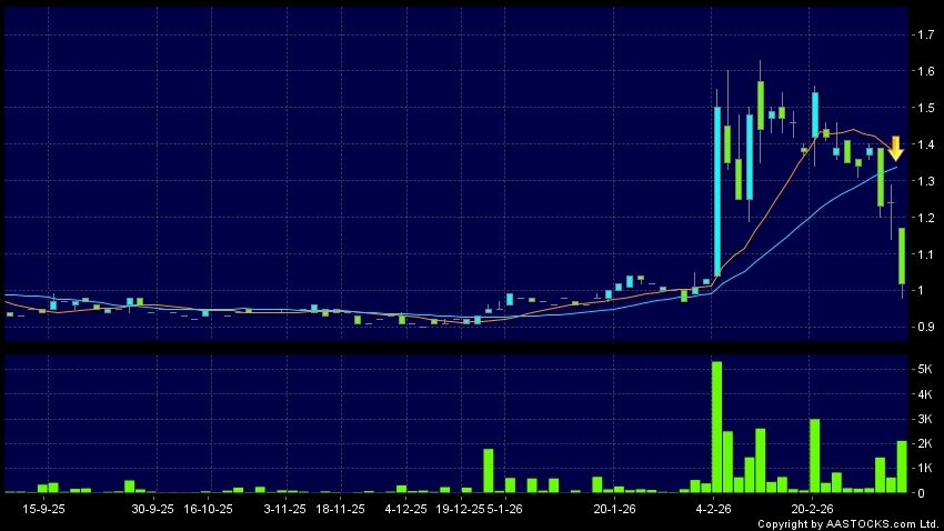 亞洲聯網科技(00679.HK) -0.020 (-1.575%) 10天移動平均線跌穿20天移動平均線,出現死亡交叉。現價報1.020,下跌17.742%,成交量2.11百萬股,成交額2.14百萬。