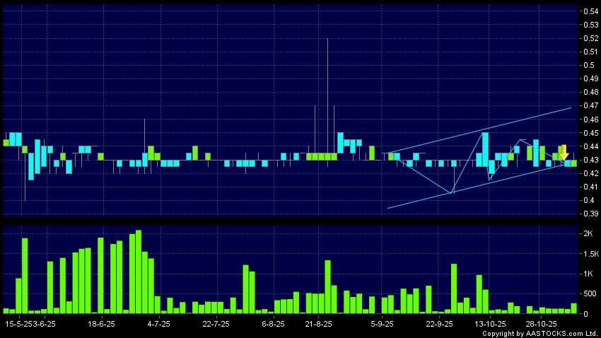 亞洲聯合基建控股(00711.HK) 0.000 (0.000%) 呈現區域下軌突破。現價報0.425,下跌1.163%,成交量26.56萬股,成交額11.52萬。