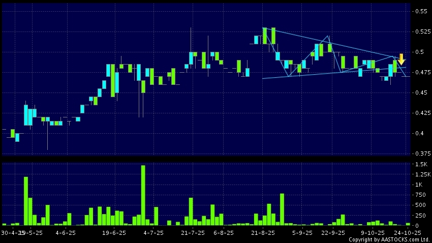 聯合醫務(00722.HK) -0.010 (-2.105%) 呈現三角形向下突破。現價報0.470,無升跌,成交量6.20萬股,成交額2.91萬。