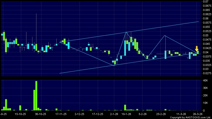 築友智造科技(00726.HK) -0.003 (-7.692%) 呈現區域下軌突破。現價報0.039,無升跌,成交量0.00股,成交額0.00。