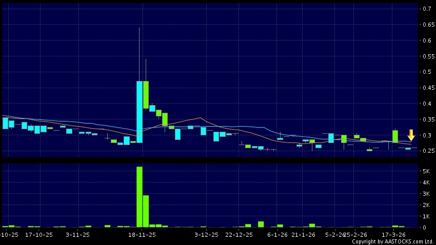 合富輝煌(00733.HK) 0.000 (0.000%) 10天移動平均線跌穿20天移動平均線,出現死亡交叉。現價報0.260,無升跌,成交量0.00股,成交額0.00。