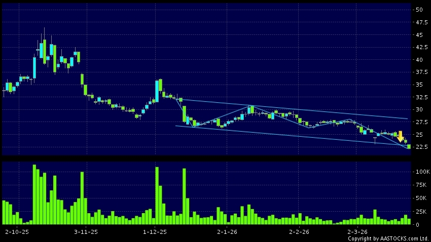 區域突破指股價在過去的一段時間只在一個範圍在內活動,然後股價下跌作出突破,跌穿區域的底部,技術走勢偏軟。(港股報價延遲最少十五分鐘。沽空資料截至 2026-03-27 16:25。)
