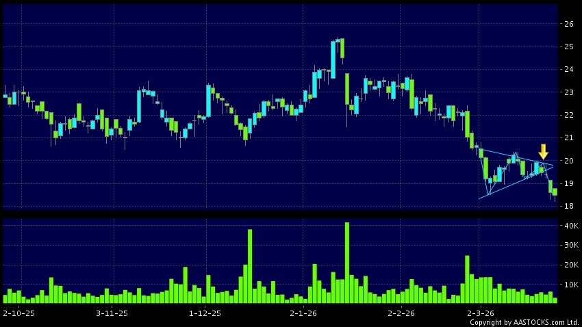 三角形向下突破是指股價的波幅漸漸收窄,在圖表上形成三角形般的狀態。股價在三角形的末端向下突破,下跌趨勢形成,技術走勢偏軟。(港股報價延遲最少十五分鐘。沽空資料截至 2026-03-24 16:25。)