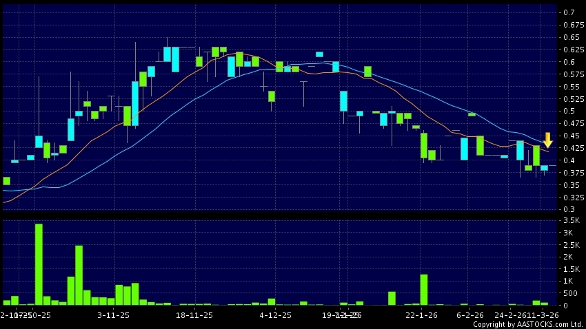 廣泰國際控股(00844.HK) 0.000 (0.000%) 10天移動平均線跌穿20天移動平均線,出現死亡交叉。現價報0.390,無升跌,成交量0.00股,成交額0.00。