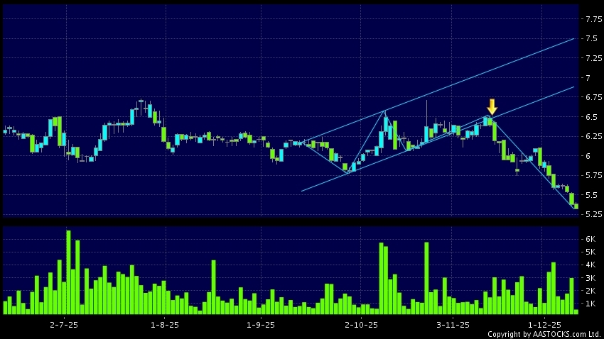 區域突破指股價在過去的一段時間只在一個範圍在內活動,然後股價下跌作出突破,跌穿區域的底部,技術走勢偏軟。(港股報價延遲最少十五分鐘。沽空資料截至 2025-12-31 12:25。)