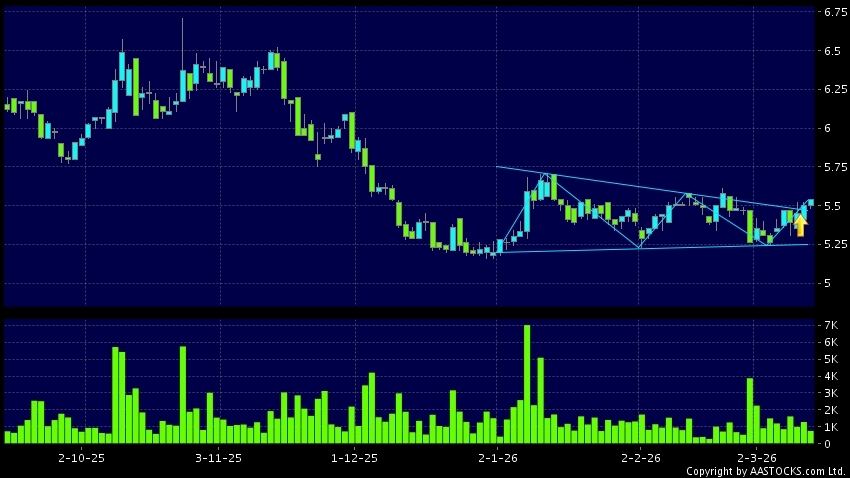三角形向上突破是指股價的波幅漸漸收窄,在圖表上形成三角形般的狀態。股價在三角形的末端向上突破,形成上升趨勢,技術走勢向好。(港股報價延遲最少十五分鐘。沽空資料截至 2026-03-20 16:25。)