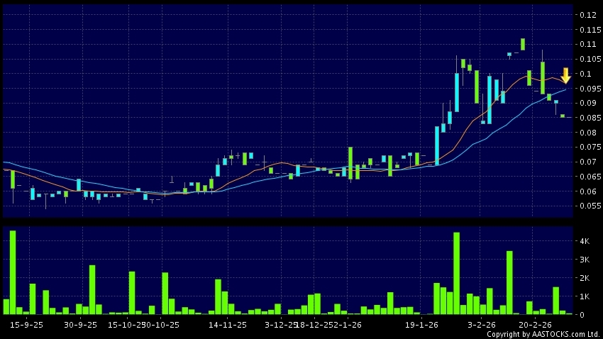 中國疏浚環保(00871.HK) -0.006 (-6.742%) 10天移動平均線跌穿20天移動平均線,出現死亡交叉。現價報0.085,無升跌,成交量7.00萬股,成交額5.90千。
