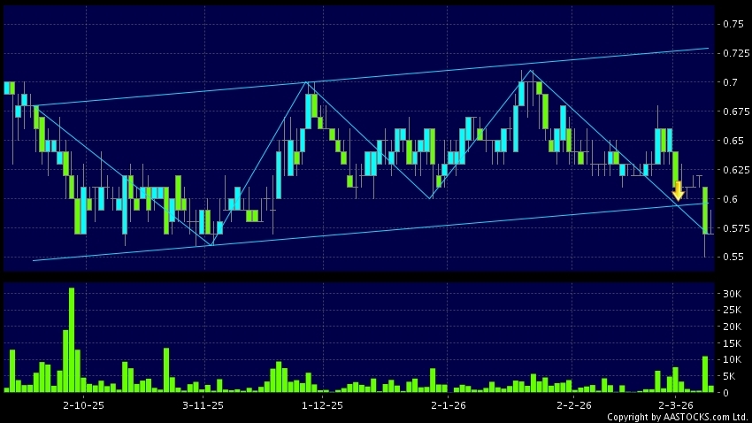 區域突破指股價在過去的一段時間只在一個範圍在內活動,然後股價下跌作出突破,跌穿區域的底部,技術走勢偏軟。(港股報價延遲最少十五分鐘。沽空資料截至 2026-03-10 16:25。)