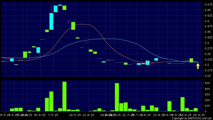 阿爾法企業(00948.HK) +0.015 (+7.317%) 10天移動平均線升穿20天移動平均線,出現黃金交叉。現價報0.211,無升跌,成交量0.00股,成交額0.00。