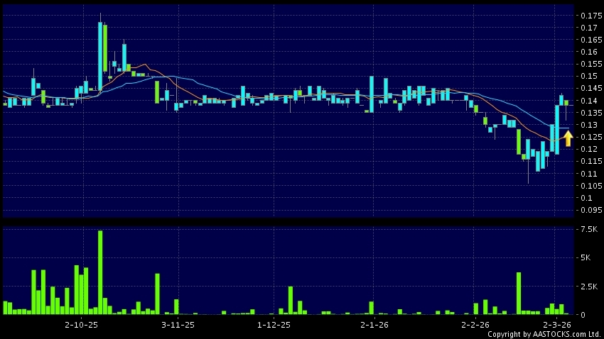 華富建業金融(00952.HK) -0.001 (-0.690%) 10天移動平均線升穿20天移動平均線,出現黃金交叉。現價報0.138,無升跌,成交量1.00萬股,成交額1.38千。