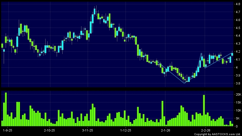 新天綠色能源(00956.HK) -0.250 (-5.631%) 沽空 $1.43百萬; 比率 2.673% 呈現杯柄形向上突破。現價報4.180,上升0.966%,成交量1.61百萬股,成交額6.74百萬。