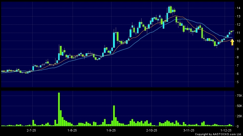 MONGOL MINING(00975.HK) +0.220 (+1.968%) 沽空 $7.29百萬; 比率 12.237% 10天移動平均線升穿20天移動平均線,出現黃金交叉。現價報11.260,上升1.625%,成交量78.90萬股,成交額8.86百萬。