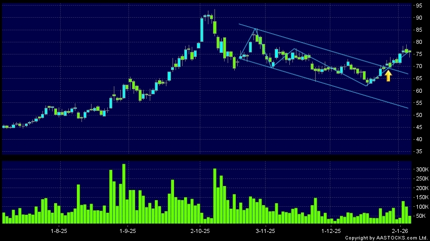 區域突破指股價在過去的一段時間只在一個範圍在內活動,然後股價上升作出突破,升穿區域的頂部,技術走勢向好。(港股報價延遲最少十五分鐘。沽空資料截至 2026-01-08 16:25。)