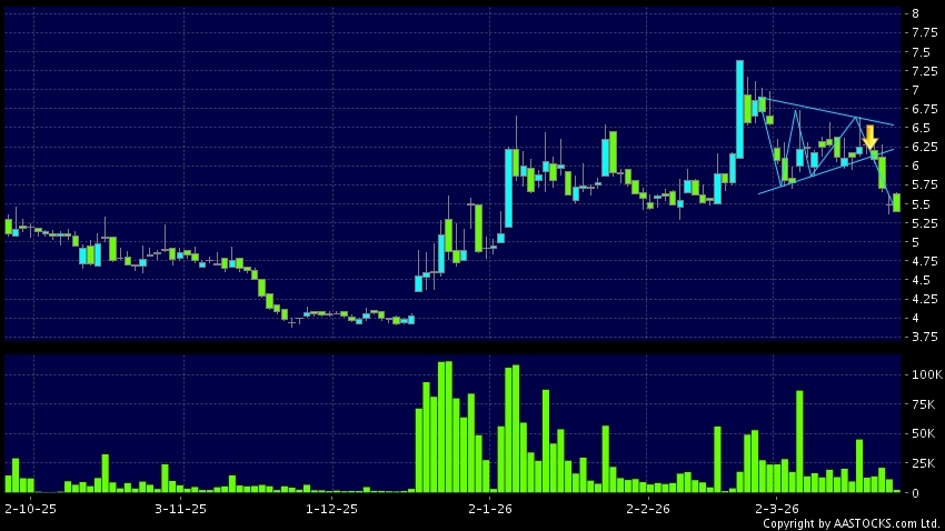 三角形向下突破是指股價的波幅漸漸收窄,在圖表上形成三角形般的狀態。股價在三角形的末端向下突破,下跌趨勢形成,技術走勢偏軟。(港股報價延遲最少十五分鐘。)