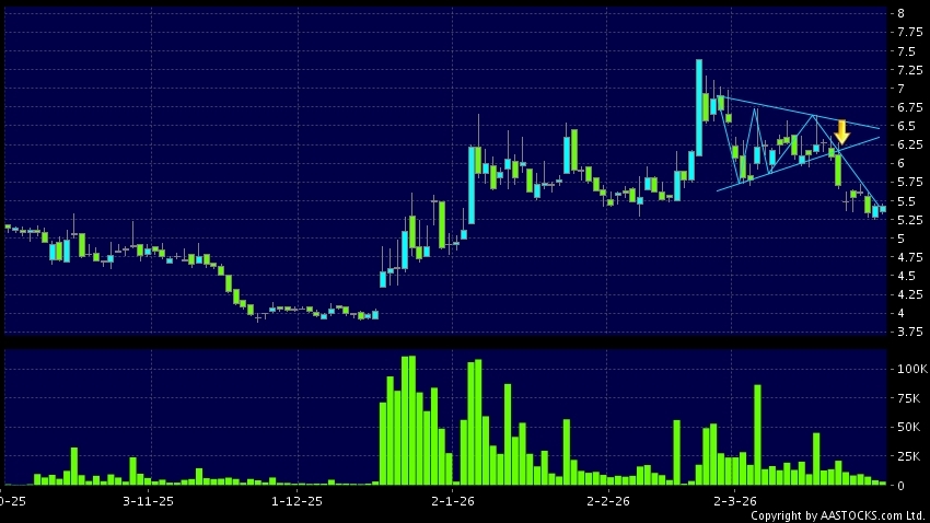 三角形向下突破是指股價的波幅漸漸收窄,在圖表上形成三角形般的狀態。股價在三角形的末端向下突破,下跌趨勢形成,技術走勢偏軟。(港股報價延遲最少十五分鐘。)