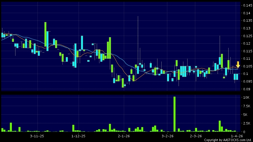 新確科技(01063.HK) +0.005 (+5.000%) 10天移動平均線跌穿20天移動平均線,出現死亡交叉。現價報0.100,無升跌,成交量1.00千股,成交額90.00。